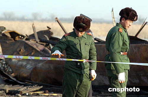 11月23日下午,11.21包頭空難現(xiàn)場(chǎng)繼續(xù)封鎖,黑匣子仍在加緊打撈。圖為兩名武警在警戒線內(nèi)值勤,身后是被燒壞的船體。中新社記者:張宇