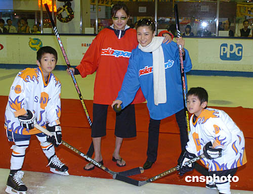 香港藝人李綺虹﹑廖碧兒25日在香港西九龍中心為2004年亞太區(qū)少兒冰球賽開球。