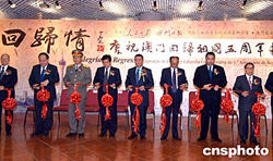由人民日?qǐng)?bào)與澳門日?qǐng)?bào)合辦的“回歸情——慶祝澳門回歸祖國五周年書畫展”,二十六日下午在澳門旅游活動(dòng)中心隆重揭幕,行政長官何厚鏵出席并參觀了書畫展。作者:梁永強(qiáng)