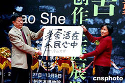 為紀(jì)念老舍先生誕辰一百零五周年,由中共廣州市委宣傳部、中國(guó)老舍研究會(huì)與中國(guó)現(xiàn)代文學(xué)館聯(lián)合舉辦的《老舍文學(xué)創(chuàng)作生涯展覽》十一月二十七日在廣州藝術(shù)博物院隆重開(kāi)幕。著名漫畫(huà)家廖冰兄先生書(shū)寫(xiě)的《老舍活在人民心中》賀詞由女兒廖凌兒代贈(zèng)送給老舍先生之子舒乙教授。作者:劉衛(wèi)勇