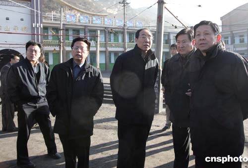 國有企業(yè)陜西銅川礦務局陳家山煤礦11月28日發(fā)生特大瓦斯爆炸事故,以國務院副秘書長尤權(右三)為組長的國務院工作組抵達后,29日上午在現(xiàn)場指導和協(xié)調(diào)人員進行搶救并開展事故調(diào)查工作。陜西省代省長陳德銘(右一)和國家安全監(jiān)管局副局長趙鐵錘(右二)等也在現(xiàn)場組織搶救。作者:任晨鳴