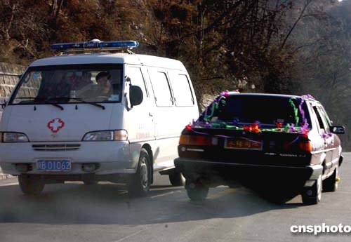 11月29日,一輛輛運送陜西銅川礦務(wù)局陳家山煤礦重傷礦工的救護車疾駛周邊醫(yī)院進行搶救。而當日農(nóng)歷10月18是“吉祥日子”,當?shù)夭簧偃艘苍诿τ诮Y(jié)婚,背道而馳的救護車與新婚喜車不經(jīng)意間構(gòu)成一幅人間亦憂亦喜的畫面。作者:任晨鳴