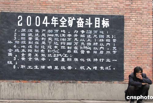 12月1日傍晚,陜西銅川礦務(wù)局陳家山煤礦被困井下礦工全部確認(rèn)遇難后,一名工人無奈地蹲在礦區(qū)的“2004年全礦奮斗目標(biāo)”宣傳牌前。有不少人認(rèn)為,此次礦難的部分原因是礦方一味追求產(chǎn)量忽視安全造成的。作者:任晨鳴