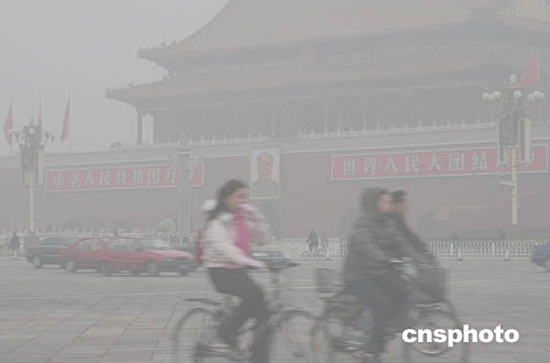十二月二日清晨,北京天安門城樓和長(zhǎng)安街籠罩在濃重的霧氣當(dāng)中。北京連日來遭遇大霧天氣,首都機(jī)場(chǎng)眾多飛機(jī)航班延誤,京開、京沈、京津、京石等高速公路相繼關(guān)閉,城市道路能見度降低,交通事故明顯增多。中新社記者:毛建軍