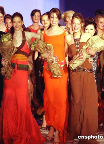 十二月二日晚,二○○四世界精英模特大賽國際總決賽在上海舉行,荷蘭選手Sofie OOSTERWAAL(圖右)獲得冠軍,美國選手Dana MARCOLINA(圖中)獲得亞軍,丹麥選手Maj BJERRE獲得季軍。作者:湯彥俊