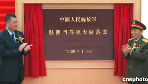 三日,解放軍駐澳部隊為新建的「駐澳門部隊大廈」舉行落成典禮,澳門特首何厚鏵、廣州軍區(qū)副政委張國初中將為新的指揮大樓揭幕。作者:梁永強