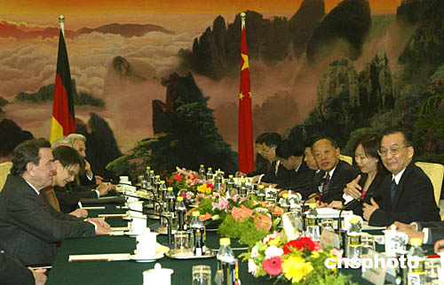 施羅德完全贊同溫家寶對德中關系的評價和建議。他說,近年來,兩國合作已達到前所未有的深度和廣度。在《德中聯(lián)合聲明》的指導下,雙邊政治交往密切,經(jīng)貿(mào)關系充滿活力,法制國家對話等機制進展良好,文化、教育交流頻繁。