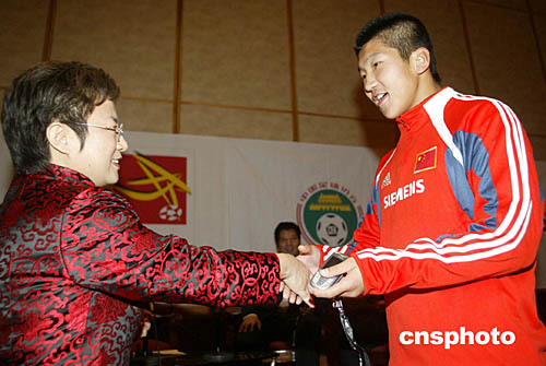 十二月七日,中國之隊主贊助商西門子有限公司在北京為即將踏上征途的“08之星足球隊”餞行,“08之星足球隊”的全體隊員以及中方教練共三十二人以及中國國家男子足球隊隊長李瑋鋒、中國足協(xié)青少部官員、西門子公司代表參加了此次活動。來自西門子公司奧運項目部部長張芳(左)在餞行儀式上向球隊的每個隊員贈送一部西門子手機,祝愿“08之星”一路順風。中新社記者:盛佳鵬