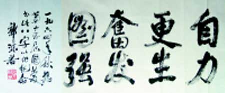 據(jù)了解,這幅寫在1.42米×3.57米宣紙上的行書“自力更生奮發(fā)圖強(qiáng)”,八個字蒼勁有力、氣勢磅礴。一些人士分析,這恐怕是郭老書寫的最大書法作品了。
