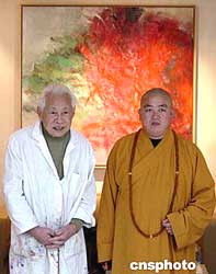 著名旅法華裔畫家趙無極近日在巴黎的畫室與少林寺釋永信方丈合影。作者:鐘誠