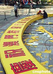 工人正在澳門佑漢公園趕制喜慶牌匾,為慶祝澳門特別行政區(qū)成立五周年,十八日澳門街坊總會將在此地舉辦“金蓮?fù)缕G齊鼓舞,彩燈璀璨慶回歸”系列大型慶祝活動。作者:梁永強(qiáng)