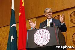 圖:巴基斯坦總理阿齊茲在清華大學(xué)演講