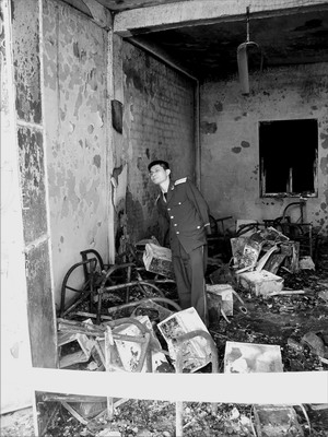 昨日上午11時(shí)左右,記者趕到現(xiàn)場(chǎng)看到,這棟兩層的樓房已被警方用警戒線封鎖,有民警在現(xiàn)場(chǎng)值班守護(hù)。大火將網(wǎng)吧內(nèi)的所有電腦設(shè)備及桌椅燒毀變形,就連距離地面約3米多高懸掛著的吊扇葉片,也被燒得變形后垂直向下,網(wǎng)吧樓上臨街的二樓全部被熏成黑色。
