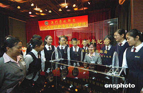 胡錦濤與夫人劉永清在澳門特首何厚鏵的陪同下參觀澳門勞工子弟學(xué)校,受到學(xué)校師生的熱烈歡迎。作者:梁永強(qiáng)