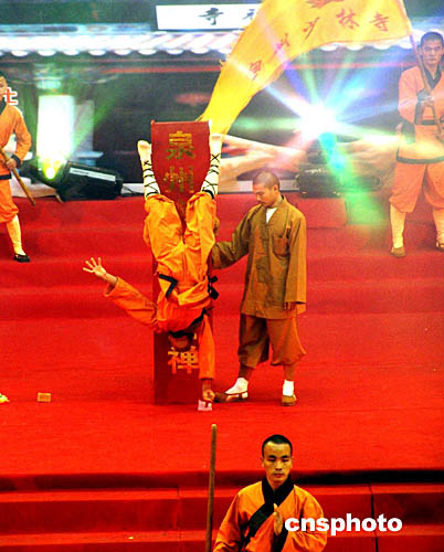 | 2004年12月19日上午,中國(guó)福建(泉州)南少林國(guó)際武術(shù)大賽,在泉州僑鄉(xiāng)體育館開(kāi)幕。開(kāi)幕式上南北少林同臺(tái)演武,精彩絕倫,其中泉州南少林寺武僧釋理亮表演的“一指禪”絕技更是讓現(xiàn)場(chǎng)嘉賓贊嘆不已。作者:石勇