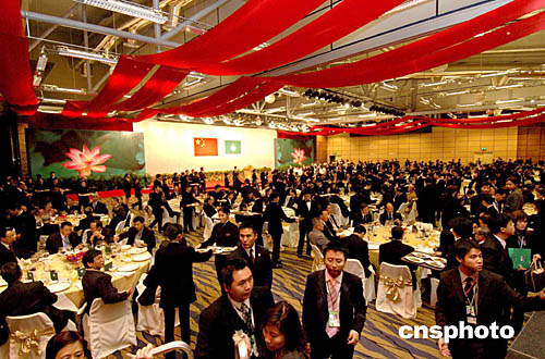 晚七時(shí),在澳門警察局銀樂(lè)隊(duì)奏響的迎賓曲和二百多名各界嘉賓的熱烈掌聲中,胡錦濤主席和夫人劉永清在澳門特區(qū)行政長(zhǎng)官何厚鏵及夫人劉渭楨的陪同下步入宴會(huì)廳。