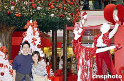 臨近圣誕節(jié),香港商場圣誕布置繽紛,又別出心裁。圖為情侶在又一城商場留影。作者:譚達(dá)明
