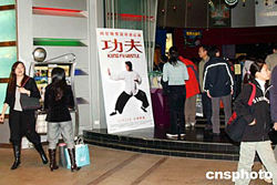 影星周星馳自編自導(dǎo)自演的《功夫》23日正式上映,香港開(kāi)畫(huà)票房收411萬(wàn)元,創(chuàng)下今年中西片最高開(kāi)畫(huà)票房紀(jì)錄,而在內(nèi)地首日亦勁收1千萬(wàn)元人民幣。圖為《功夫》宣傳海報(bào)放在戲院門(mén)前顯眼位置。作者:譚達(dá)明
