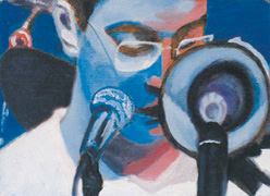 竇唯還特別喜歡用畫描繪自己樂隊演出時的景象,在昨日曝光的作品中就有兩幅。從畫面上看,一組搖滾樂隊正在舞臺上盡情揮灑激情,而臺下的觀眾也投入欣賞。另外一幅自畫像更是惹眼,藍色是畫的基調,畫中的竇唯掩在兩只話筒后面,低頭正沉醉地低唱著。總的看來,竇唯的小畫未必惹眼但很精妙。不賣不展