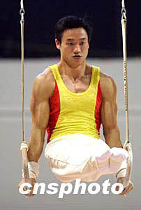 5月14日晚,中國國家體操隊(duì)隊(duì)員楊威在江蘇蘇州舉行的全國體操錦標(biāo)賽暨雅典奧運(yùn)選拔賽資格賽吊環(huán)比賽中大顯身手,并以總分57.825分的成績獲得全能冠軍。中新社記者:盛佳鵬
