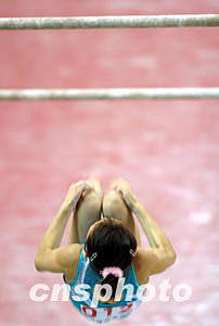 2004年5月15日,2004全國(guó)體操錦標(biāo)賽暨奧運(yùn)會(huì)預(yù)選賽的女子資格賽在江蘇省蘇州市體育中心體育館舉行,來自全國(guó)19個(gè)省市的代表隊(duì)參加了此次比賽。圖為女子高低杠比賽。中新社記者:盛佳鵬