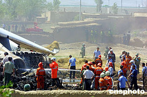 中新網(wǎng)5月18日電 一貨運(yùn)包機(jī)今日上午11時(shí)左右在烏魯木齊國際機(jī)場加油后起飛不久墜落。記者在飛機(jī)失事的三坪農(nóng)場七連看到,飛機(jī)墜落在民房中間,現(xiàn)場有10多輛救護(hù)車輛進(jìn)行搶救。救援人員正在努力打開失事飛機(jī)的駕駛艙搶救機(jī)組人員。目前,傷亡情況不詳。