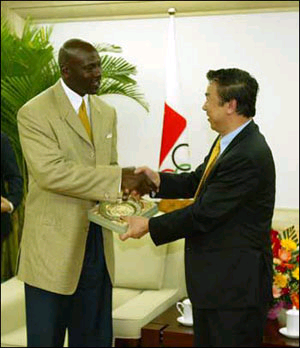 喬丹首先對中國奧委會和袁偉民主席的接見表示感謝,他說:“這是我第一次來中國,我期待著見到更多的球迷。我在NBA打球時,曾經(jīng)與中國球星姚明等同場競技,感覺非常愉快。本次中國之行的主要目的就是與中國青年接觸,通過籃球教育青年,推廣籃球!