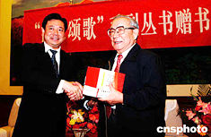 五月十九日,山東省臨沂市在北京人民大會(huì)堂舉行《沂蒙頌歌》大型叢書(shū)贈(zèng)書(shū)座談會(huì)。中共臨沂市委書(shū)記李群向曾在沂蒙地區(qū)指揮作戰(zhàn)的原中央軍委副主席、國(guó)防部長(zhǎng)遲浩田(右)贈(zèng)書(shū)。中新社記者:王麗南