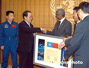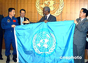 去年今年九月“神五”升空前四十天時(shí),聯(lián)合國(guó)維也納辦事處代表安南秘書長(zhǎng),把一面聯(lián)合國(guó)旗幟移交給中國(guó)常駐維也納代表團(tuán),并現(xiàn)場(chǎng)轉(zhuǎn)交給中國(guó)載人航天工程辦公室。后來,這面聯(lián)合國(guó)旗和中國(guó)國(guó)旗伴隨楊利偉,在太空繞地球運(yùn)行十四圈,行程約六十萬公里。今天,中國(guó)載人航天工程代表團(tuán)訪問紐約聯(lián)合國(guó)總部。代表團(tuán)成員楊利偉把這面旗幟正式移交回聯(lián)合國(guó)。
