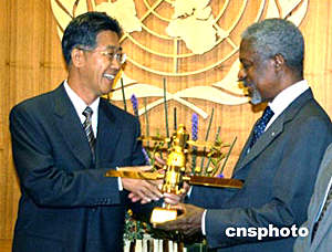 胡世祥把一個(gè)金光閃閃的“神舟”五號(hào)飛船模型贈(zèng)送給安南秘書長(zhǎng),并表示,聯(lián)合國(guó)在和平利用外層空間等國(guó)際事務(wù)中發(fā)揮著積極和重要的作用。中國(guó)航天界感謝安南秘書長(zhǎng)和世界人民對(duì)中國(guó)航天事業(yè)的支持。中國(guó)人民愿與國(guó)際同行加強(qiáng)合作,為全人類探索與和平利用外空的事業(yè)作出更大貢獻(xiàn)。