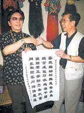 談到變臉風(fēng)波,曾金貴真誠地對(duì)彭登懷說了聲“對(duì)不起”。“正像我這副字上面寫的,我只是一個(gè)老頑童,彭大師才是真正的變臉大師。我今天就是要向彭登懷表達(dá)我的歉意,但是川湘情意濃卻是大家都希望的!薄皩(duì),川湘情意濃!”彭登懷連連點(diǎn)頭。