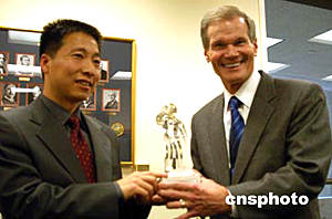 當?shù)貢r間五月二十日下午,中國首位進入太空飛行的航天員楊利偉在華盛頓會晤美國上世紀八十年代的航天員、現(xiàn)在的國會參議員比爾·納爾遜。這是楊利偉向納爾遜贈送中國航天員水晶模型。中新社記者:余東暉