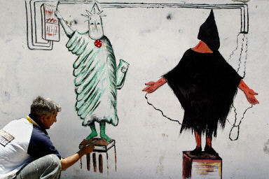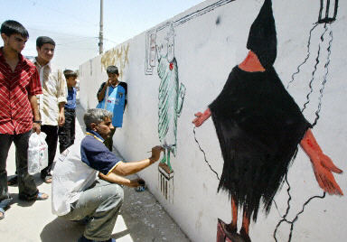 5月23日,一名伊拉克藝術(shù)家在巴格達附近的薩德爾城將美軍虐待伊拉克俘虜?shù)恼掌嫷綁Ρ谏,并在旁邊畫上一個美國“自由女神像”。
