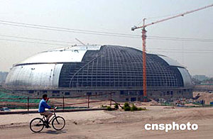 五月二十四日,建筑安裝工人正在國(guó)家大劇院殼體穹頂施工。國(guó)家大劇院橢圓形殼體穹頂自四月一日開(kāi)始安裝鈦金屬板以來(lái),工程進(jìn)展順利,預(yù)計(jì)六月底完成。中國(guó)國(guó)家大劇院由法國(guó)設(shè)計(jì)師保羅·安德魯設(shè)計(jì)。中新社記者:張煒