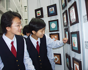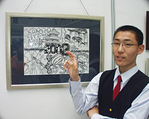 記者在展覽上看到,在寬敞的大廳內(nèi),擺滿了學(xué)生創(chuàng)作的作品,包括版畫、民間剪紙、刮畫、紙雕、面具、漫畫、海報、中國結(jié)等十多種,內(nèi)容涉及更廣,如環(huán)保、奧運(yùn)會、行為規(guī)范、國慶等。十四歲的葛雅靜,看上去十分靦腆。這次展覽她如魚得水,有五幅作品入選,是所有參展學(xué)生最多的。她的刮畫極富想象力豐富,吸引觀者駐足。據(jù)她說,父母都不是從事藝術(shù)工作的,她是上藝術(shù)課上后,逐漸發(fā)現(xiàn)自己愛上畫畫了。