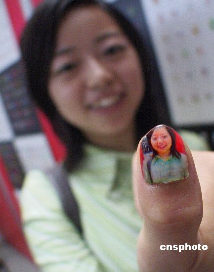5月26日,一名年輕女性在江蘇展覽館向人們展示以自己形象為圖案的指甲。正在這里舉辦的第七屆美容美發(fā)博覽會(huì)上展示的最新技術(shù)數(shù)碼美甲機(jī)可以將各種圖案畫在你的指甲上,甚至是你自己或家人的照片。秦淮 攝