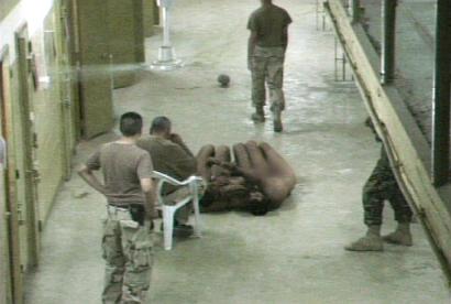 在其中一張照片中,一個(gè)美國(guó)士兵用膝蓋狠狠頂住囚犯的頸部,而這個(gè)囚犯已經(jīng)在地板上縮成一團(tuán)。不愿透露姓名的人士告訴NBC說(shuō),照片中有些人是美國(guó)軍事情報(bào)部門(mén)的官員,其中一個(gè)據(jù)信是情報(bào)官員的男子正在朝囚犯身上扔擲某種無(wú)法辨認(rèn)的物體。