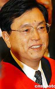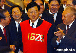 中共中央政治局委員、廣東省委書記張德江,五月三十一日來到香港聯(lián)合交易所進(jìn)行訪問,圖為出市代表贈送張德江紅馬甲。中新社記者:錢興強(qiáng)