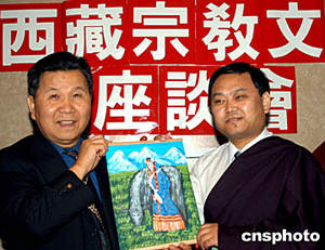 美東時間五月三十一日,正在紐約訪問的中國藏學(xué)家、活佛代表團(tuán)參加紐約亞美文化協(xié)會主辦的“西藏宗教文化座談會”。中央民族大學(xué)副校長喜饒尼瑪(右)向亞美文化協(xié)會會長黃哲操(左)贈送手繪唐卡、史詩《格薩爾》唐卡圖冊等禮物。作者:趙海燕