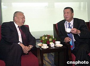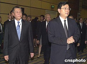 澳門特區(qū)行政長官何厚鏵與香港特區(qū)行政長官董建華在論壇開始前交談。作者:梁永強