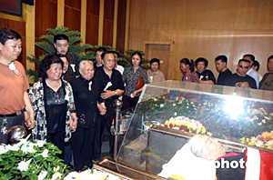 在鄭州市殯儀館內(nèi),記者看到,躺在鮮花叢中的常老是那樣的安詳。鮮花簇?fù)淼撵`柩上,覆蓋著一面鮮紅的中共黨旗。靈柩上方,黑紗環(huán)繞著常香玉的照片——花白頭發(fā),寬邊眼鏡,大紅毛衣外罩,端莊慈祥寧靜的笑容,一派優(yōu)雅。雖然其親屬根據(jù)常老的遺愿盡量使儀式簡樸,然而前往吊唁的各界人士一度達(dá)到幾千人,整個(gè)儀式大廳被圍了個(gè)水泄不通。