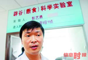 據(jù)彭先生介紹,1996年他曾在工廠里自行絕食過53天。開頭的幾天內(nèi),感到很難受,到了第四天以后,饑餓感消失,而且感覺很舒服,思維、行動變得敏捷靈活了!爸灰莆兆銐虻尼t(yī)學(xué)理論,絕食60天絕對沒有問題!迸硐壬@得非常自信地說。