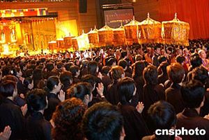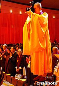 閉幕典禮前,香港佛教界還舉辦了隆重莊嚴(yán)的“圓滿傳供”禮佛儀式。約四千名佛教徒身著法衣,跪拜佛前,在悠揚(yáng)的念佛聲中,依序?qū)ⅰ跋恪、“花”、“燈”、“果”、“荼”、“食”等供品傳遞到供奉著佛指舍利和三寶佛的禮臺(tái)上,以感念佛陀恩澤,并表達(dá)對(duì)佛陀的最高敬意。整個(gè)儀式長(zhǎng)達(dá)兩個(gè)多小時(shí)。