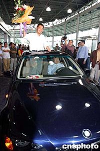 隨著陜西西安“體育彩票造假案”全案告破,六月四日下午,陜西省西安市體彩中心負(fù)責(zé)人宣布劉亮于三月二十三日所獲特等A獎彩票有效,并向其當(dāng)面交付所中得的寶馬轎車。同時,陜西省、西安市體育局負(fù)責(zé)人向劉亮公開道歉。圖為劉亮喜獲寶馬車后的情形。作者:李宗文