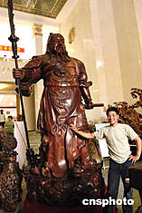 六月在北京民族文化宮舉辦的首屆中國民間工藝品博覽會上,一尊大型紫花梨木雕像“九龍關公”令人嘆為觀止。該雕像高三點二米,加上佩刀總高三點六六米,重三噸,是用四點二米高的梨木制成。該雕像作品由沈陽根雕藝術家劉家鵬、趙維強(圖)和劉自豪歷經(jīng)三年制作而成。中新社記者:鄒憲