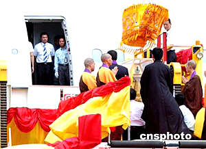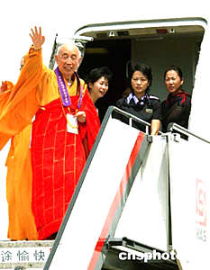 中國佛教協會副會長圣輝法師五日上午在香港國際機場登上恭送佛指舍利專機,護送佛指舍利回法門寺。中新社記者:趙振清