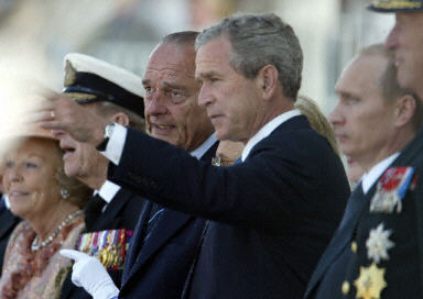 據(jù)報道,參加這次慶典的領(lǐng)導人包括法國總統(tǒng)希拉克、美國總統(tǒng)布什、英國女王伊麗莎白二世和英國首相布萊爾、俄羅斯總統(tǒng)普京、德國總理施羅德等。其中德國領(lǐng)導人是第一次應邀參加二戰(zhàn)關(guān)鍵紀念日的活動。