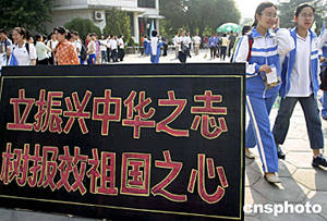 二○○四年高考首日的六月七日,北京天氣涼爽。各考場外豎立著各種鼓舞考生的標語牌,鼓勵學生以最佳心態(tài)應考。中新社記者:張勤