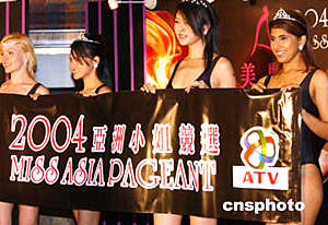 2004亞洲小姐競(jìng)選發(fā)布會(huì)六月八日在香港舉行,圖為模特在發(fā)布會(huì)上展示標(biāo)語。