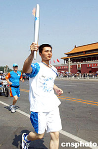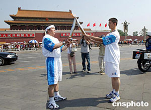 在火炬點燃后,在148名火炬手中第一個出場的國家體育總局副局長、中國奧委會副主席、北京奧組委副主席于再清接過火炬,開始了這次傳遞活動。據(jù)悉,NBA休斯頓火箭隊中鋒姚明擔當最后一棒。